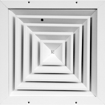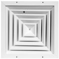 Quadratische Deckenluftauslässe mit flachen feststehenden Lamellen.